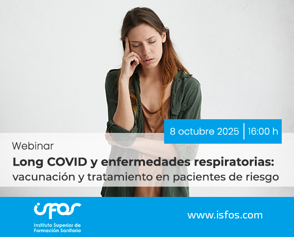 Nuevo webinar “Long COVID y enfermedades respiratorias: vacunación y tratamiento en pacientes de riesgo”, un encuentro organizado por ISFOS, el Instituto Superior de Formación Sanitaria del Consejo General de Enfermería, en colaboración con Pfizer, que tendrá lugar el próximo miércoles 8 de octubre de 16:00 a 18:00 CEST.