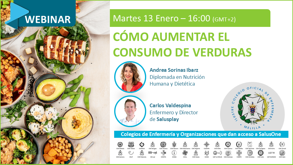 El Colegio Oficial de Enfermería de Melilla a través de SalusOne, te ofrece un Nuevo Webinar ALIMENTACIÓN SALUDABLE 👉 CÓMO AUMENTAR EL CONSUMO DE VERDURAS
