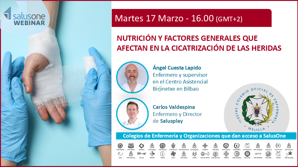 El Colegio Oficial de Enfermería de Melilla a través de SalusOne, te ofrece un Nuevo Webinar CONOCIMIENTO ? NUTRICIÓN Y FACTORES GENERALES QUE AFECTAN A LA CICATRIZACIÓN DE LAS HERIDAS