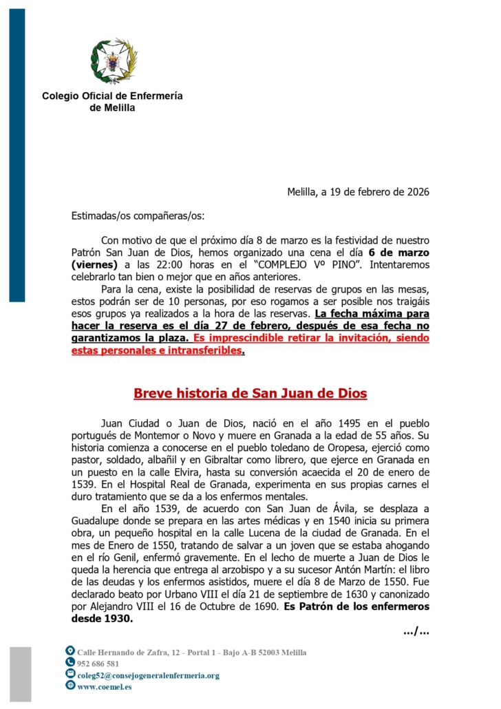 Para reservar su invitación póngase en contacto con la Sede Colegial, tanto por vía telefónica Tlf.: (952 68 65 81 / 608 856 956) como por correo electrónico (coleg52@consejogeneralenfermeria.org).